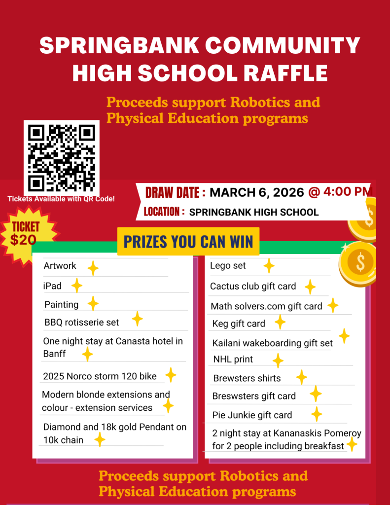 The Springbank Community High School Raffle is organized by Friends of Springbank High School to raise funds for student programs. Funds raised will support initiatives such as robotics, physical education, athletics, and other approved programs based on school needs.